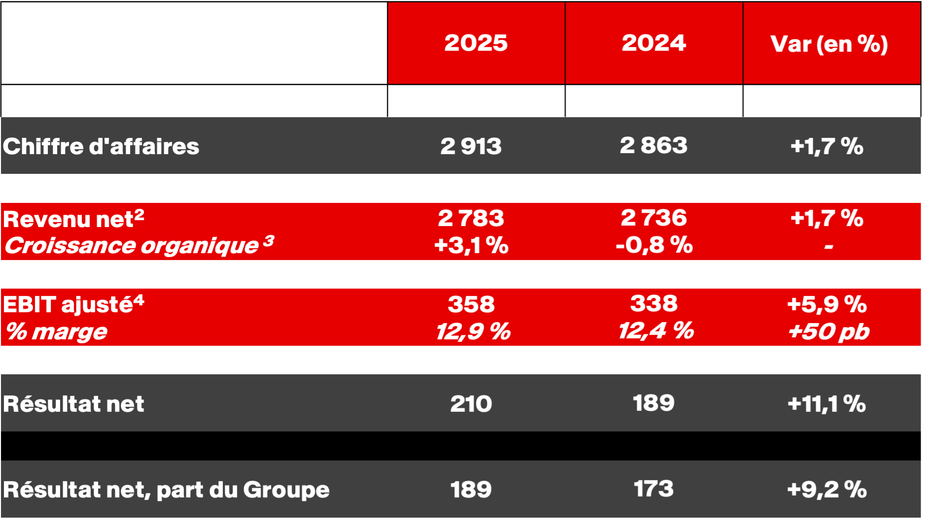 - La croissance organique7 du revenu net ressort à 3,1 % (contre -0,8 % en 2024). En conséquence, la croissance organique de 2025 dépasse légèrement la borne supérieure de l’objectif, fixé entre +2,5 % et +3,0 %.