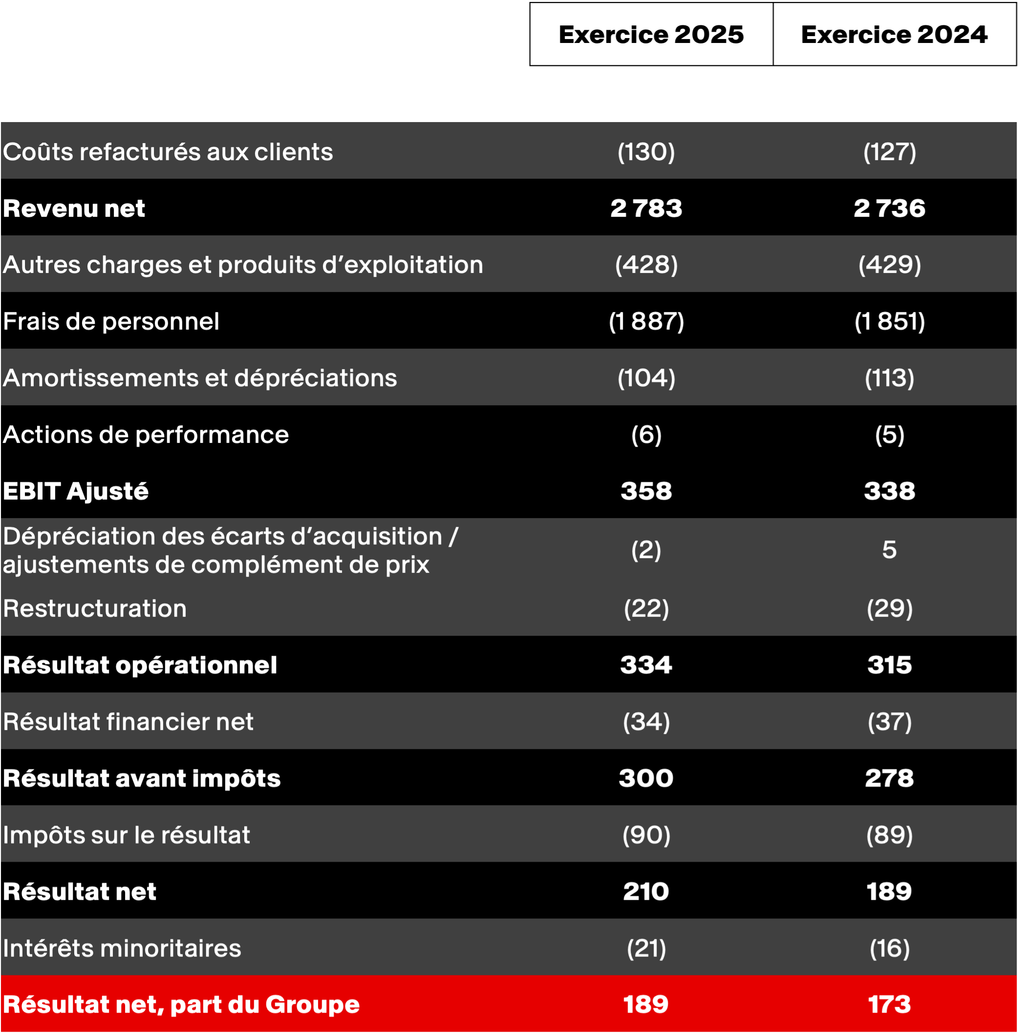 Le résultat net, part du Groupe s’élève à 189 millions d’euros, contre 173 millions d’euros en 2024.