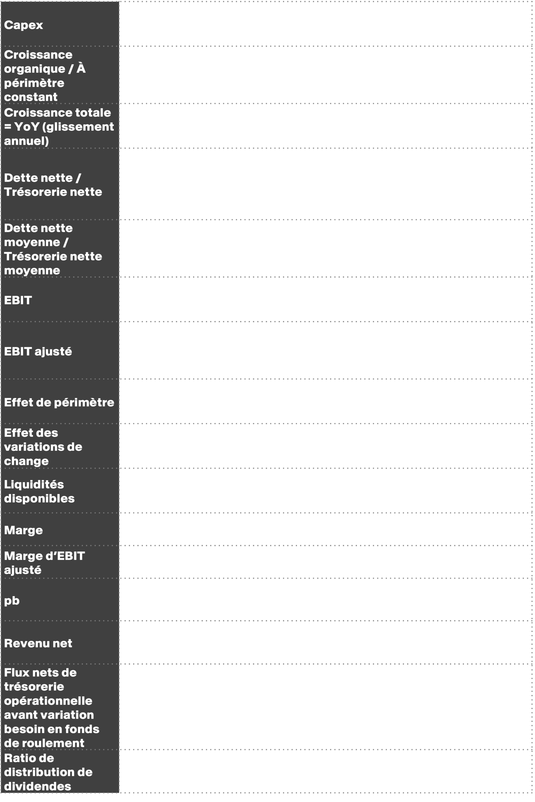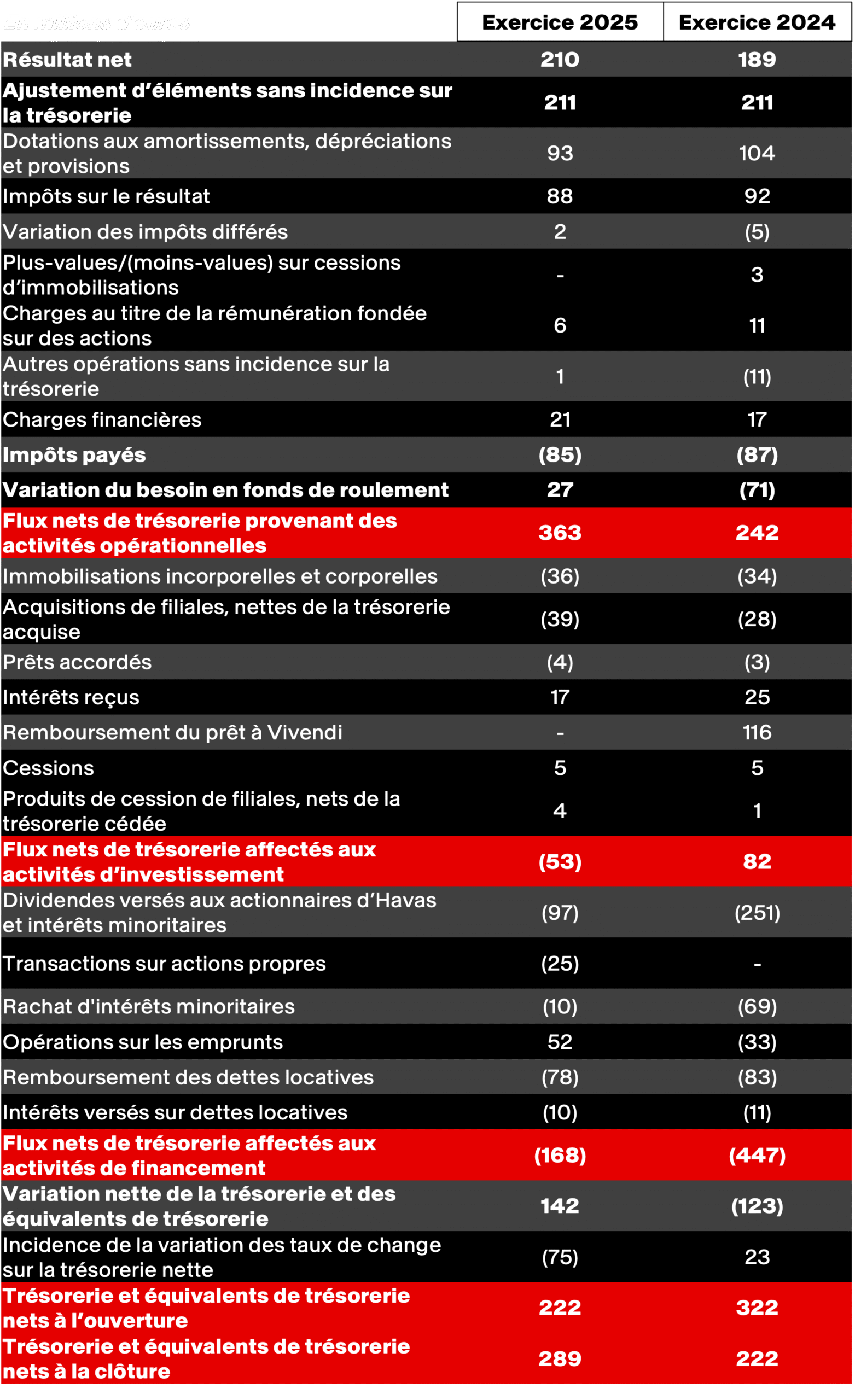 À compter du 29 juillet 2025, Havas publiera l’indicateur de Flux nets de trésorerie provenant des activités opérationnelles avant et après variation du besoin en fonds de roulement comme un indicateur non-IFRS défini dans le glossaire financier ci-dessus (« Flux nets de trésorerie provenant des activités opérationnelles avant variation du BFR » et « Flux nets de trésorerie provenant des activités opérationnelles après variation du BFR »). Ce nouvel indicateur sera communiqué à l’avenir en plus des flux de trésorerie disponibles (définis comme la trésorerie nette générée par les activités opérationnelles moins les dépenses d’investissement). La direction estime que les Flux nets de trésorerie provenant des activités opérationnelles avant variation du besoin en fonds de roulement fournissent une information plus fiable sur la capacité d’Havas à générer de la trésorerie que les flux de trésorerie disponibles. En effet, les Flux nets de trésorerie provenant des activités opérationnelles avant variation du besoin en fonds de roulement ne tiennent pas compte des variations à court terme, externes ou encore saisonnières du besoin en fonds de roulement d’Havas. Pour l’année 2025, les Flux nets de trésorerie provenant des activités opérationnelles avant variation du BFR s’établissent à 333 millions d’euros, en hausse par rapport aux 306 millions d’euros de 2024. Pour l’année 2025, les Flux nets de trésorerie provenant des activités opérationnelles après variation du BFR s’établissent à 360 millions d’euros, en hausse par rapport aux 235 millions d’euros de 2024. En 2025, les flux de trésorerie disponibles s’élèvent à 324 millions d’euros, contre 201 millions d’euros en 2024.