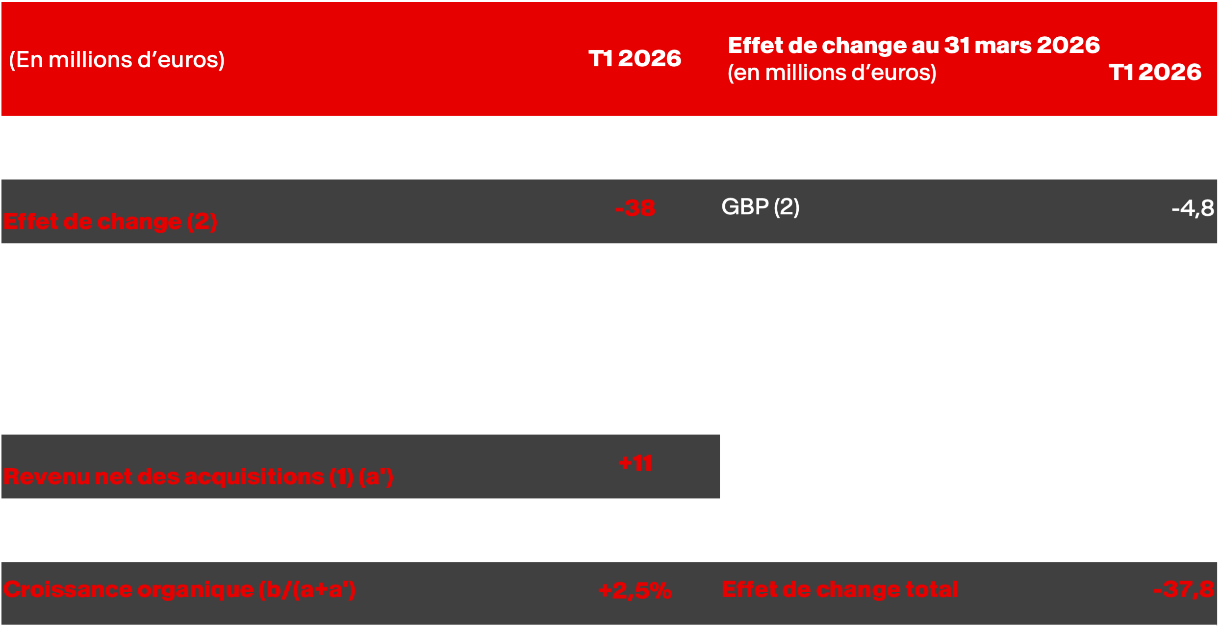 (2) EUR = 1,174 USD en moyenne au T1 2026 contre 1,045 USD en moyenne au T1 2025.